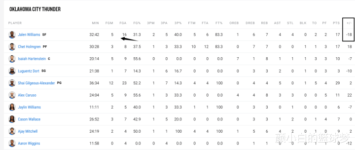 杰威在场-18雷霆最差,多尔特7中1(在场-10),亚历山大在场+2,霍姆格伦8中3(在场+18),杰威才是先发之中在场表现最差的那个。